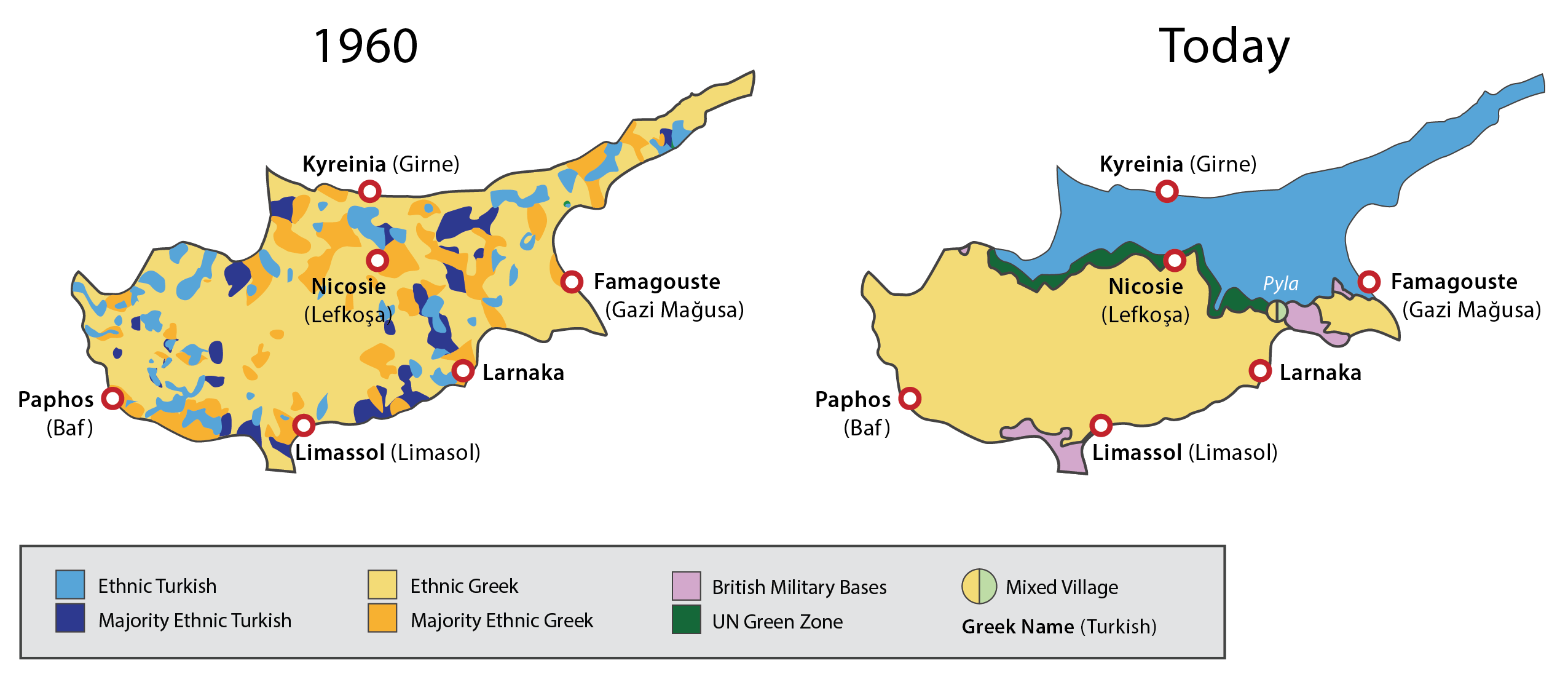 - The island of Cyprus has long been home to both Greek and Turkish Cypriot communities. After Cyprus gained its independence in 1960, the communities entered into a partnership agreement.