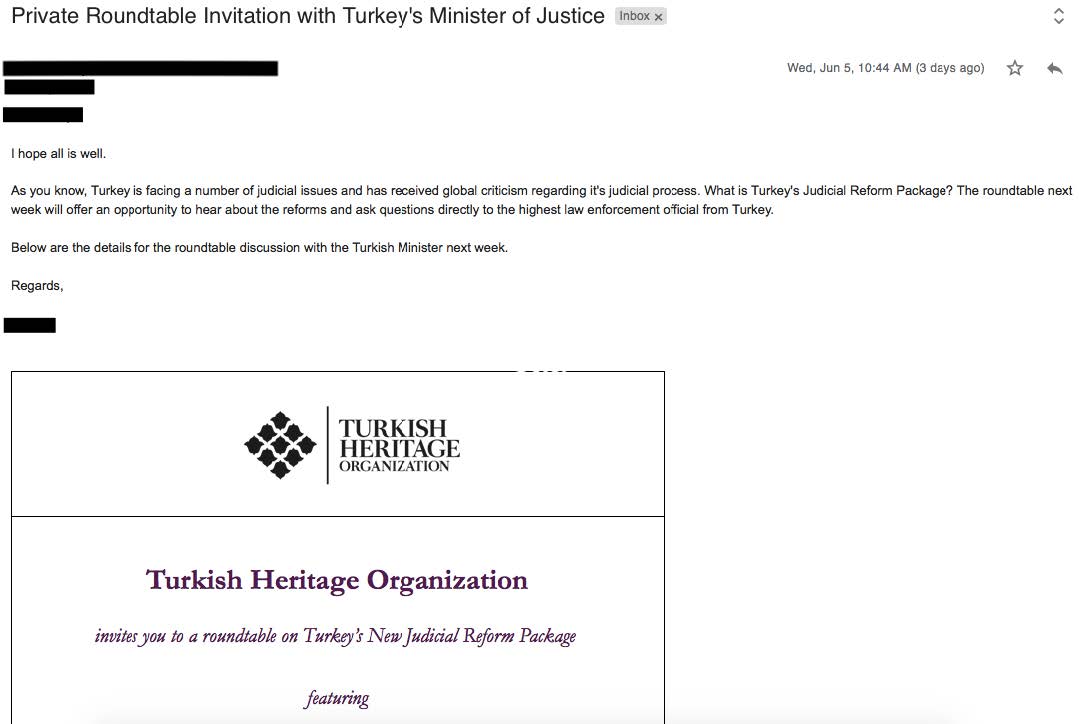 In an email shared on Twitter, an individual claimed that an honorarium would be provided for individuals to attend a THO organized panel with the Turkish Minster of Justice. We’d like to make it clear THO was not aware of this invitation and certainly would not support such an invitation. THO’s invitation to this private roundtable was sent to a number of prominent D.C. based individuals, and that invitation below is the only invitation used by THO staff to invite to the roundtable.